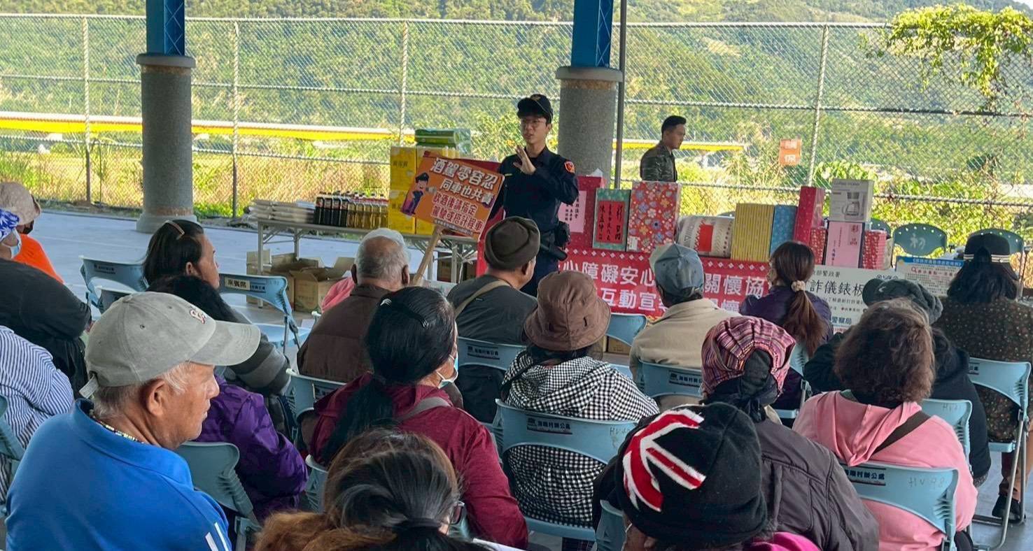 活動中由海端聯合所警員陳宏華及洪于涵擔任宣講人,針對近期常見的詐騙手法進行重點說明,包括假投資、假冒公務機構、假親友借錢等詐騙類型,提醒民眾務必提高警覺,牢記「不輕信、不透露、不轉帳」三原則,遇有疑似詐騙情形,可立即撥打165反詐騙專線或110報案查證,避免辛苦積蓄落入詐騙集團手中。在交通安全宣講方面,警方則提醒族人外出行走或騎乘機車時,務必遵守交通規則,晨昏及夜間出門運動或散步時,應穿著亮色衣物或配戴反光裝備,以提升用路辨識度,降低交通事故發生風險。針對學童族群,也特別呼籲家長加強叮嚀孩子遵守交通安全,並留意上下學途中自身安全。為提升宣講成效,活動中設計有獎徵答與民眾互動,答對問題即可獲得實用又具教育意義的宣導品,包括「反光拍拍圈」,可在晨昏外出運動時佩戴於手腕上,增加來車辨識度;以及「警徽警笛組」,可掛在學童書包上,若遇到緊急狀況時可吹響警笛,引起周遭注意並達到嚇阻效果,深受大小朋友喜愛。