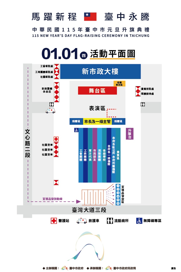 民政局補充,115年元旦升旗典禮將發放限量5,000份紀念小物「國際知名漫畫角色置物盒」、中華民國國旗及台中Hi8紋身貼紙、小國旗,當日上午6時起,將於排隊隊伍起點發放兌換券,並自6時30分開始開放領取,民眾須於7時30分前持兌換券,配合現場動線及遵守排隊秩序完成兌換。另7時40分表演節目開始、升旗典禮8時正式舉行,不便到場的民眾,元旦當日上午7時40分也可透過市長盧秀燕臉書粉絲專頁 ( https://m.facebook.com/LuShiowYen )觀看現場直播。