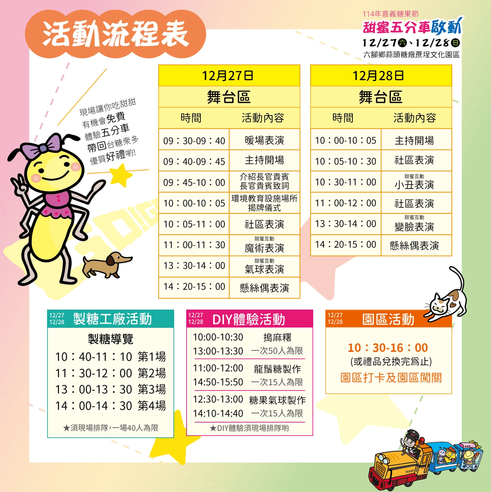 台糖指出,「114年嘉義糖果節—甜蜜五分車啟動」活動也於明日同步開跑。今年糖果節以「甜蜜體驗」為核心,規劃包含甜點市集、闖關活動、製糖工場導覽、DIY手作體驗、街頭藝人演出等精彩內容。活動亮點之一為「甜蜜五分車」體驗活動,特別開放六腳鄉在地學童免費搭乘,透過車長的導覽解說,瞭解早期糖業運輸的情景,一般民眾亦可參加闖關活動兌換五分車體驗券,一起體驗糖業文化之旅。