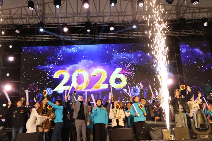 睽違12年雲林再度舉辦大型跨年晚會,昨(31)晚在雲林縣立田徑場盛大登場!下午即湧現踴躍排隊人潮,晚會11組卡司輪番上場,包括羅志祥、周湯豪、艾怡良、舞思愛、吳卓源、AcQUA源少年、薛恩、慢慢說、甜約翰、西屯純愛組以及「韓團HIGHLIGHT」,現場吸引超過2萬名以上粉絲共度跨年夜,氣氛high到最高點!縣長張麗善率領一級主管、立委張嘉郡、議長黃凱率議員團隊及多位鄉鎮市長上台,與民眾齊聲倒數迎接2026。張縣長表示,祝福大家新的一年平安順利、圓滿吉祥,更期盼世界和平。