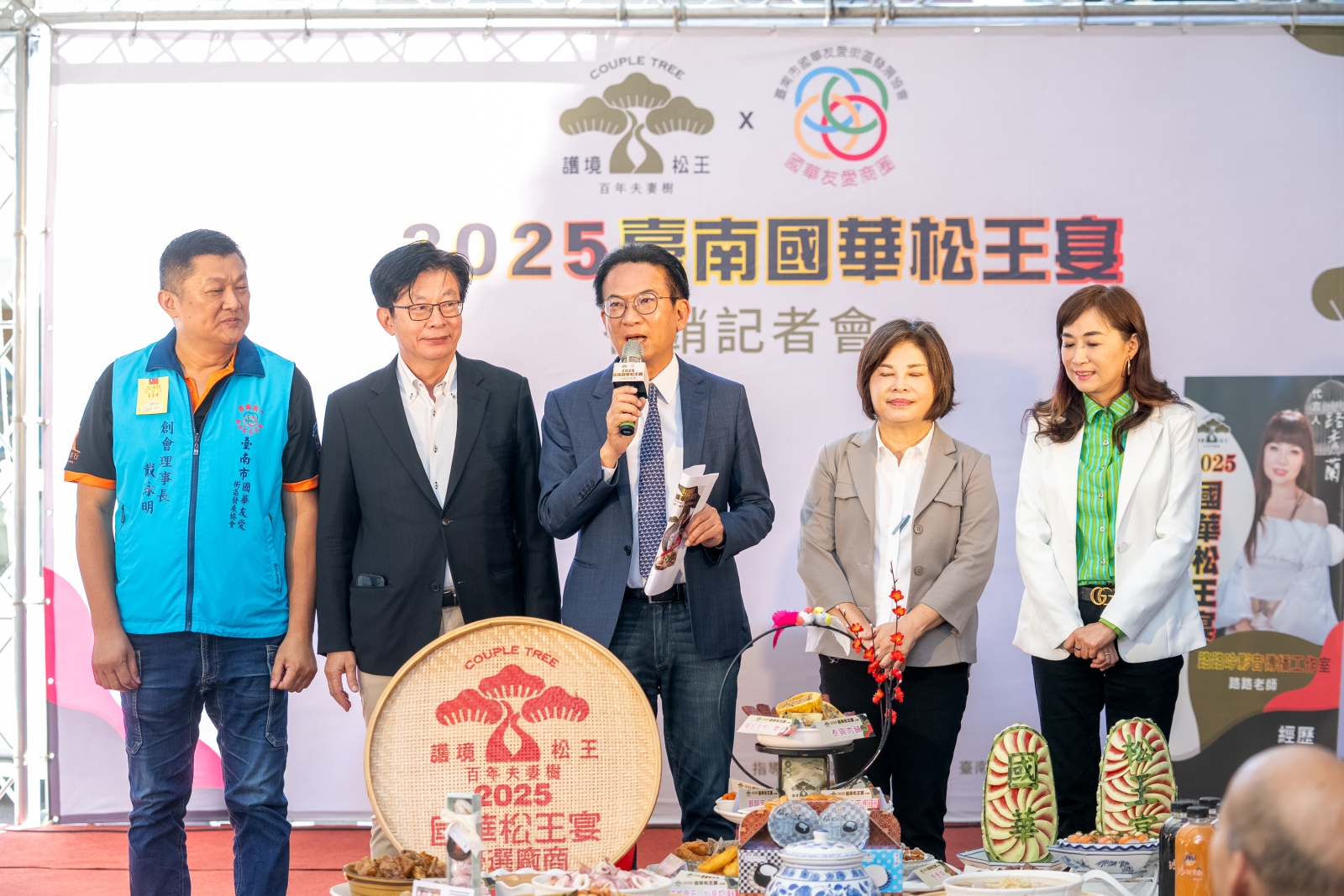 院長最後表示,要成功經營一個商圈,著實不易,他再次感謝在場各位委員大力為台南餐飲、小吃、夜市文化促銷推廣,及國華商圈戴理事長和各位攤商、店家的努力經營,他也呼籲全國消費者,一同刺激帶動國內觀光產業回復興旺榮景。他另補充談到,剛才了解活動主題取名為「松王宴」的由來,原來是台南國華街附近佇立著一棵被稱為「護境松王夫妻樹」的百年老樹,期望消費者有機會能多多造訪有400年歷史,集富庶文化及特色美食於一身的台南府城,也不忘來國華街夫妻樹這裡拍照、享受美食饗宴,相信一定能留下非常美好的回憶。