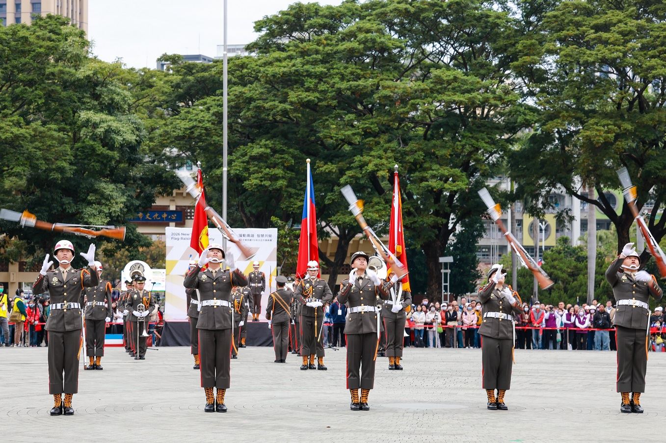 元旦升旗典禮由高雄女中樂儀隊揭開序幕,並結合國軍娃娃活力熱舞與海軍陸戰隊精湛操槍演出。圓形廣場一早就聚集許多民眾,大家齊唱國歌,迎接新年到來。市府民政局表示,今年現場循例發放的一卡通紀念卡,由插畫家馬里斯設計,以童趣的生肖馬為主要元素,搭配燦爛天空、山巒、港灣、建築等圖像,象徵夢想從海港城市啟程奔馳,迎向未來。