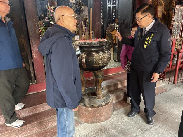 針對昨日媒體報導臺南市北區全臺首邑縣城隍廟遭不明人士破壞法器文物設施一案,市府民政局長姜淋煌於今(1/9)日代表黃偉哲市長前往縣城隍廟,向主任委員黃百榮關心受損現況,並表達市府對本案之高度關切。