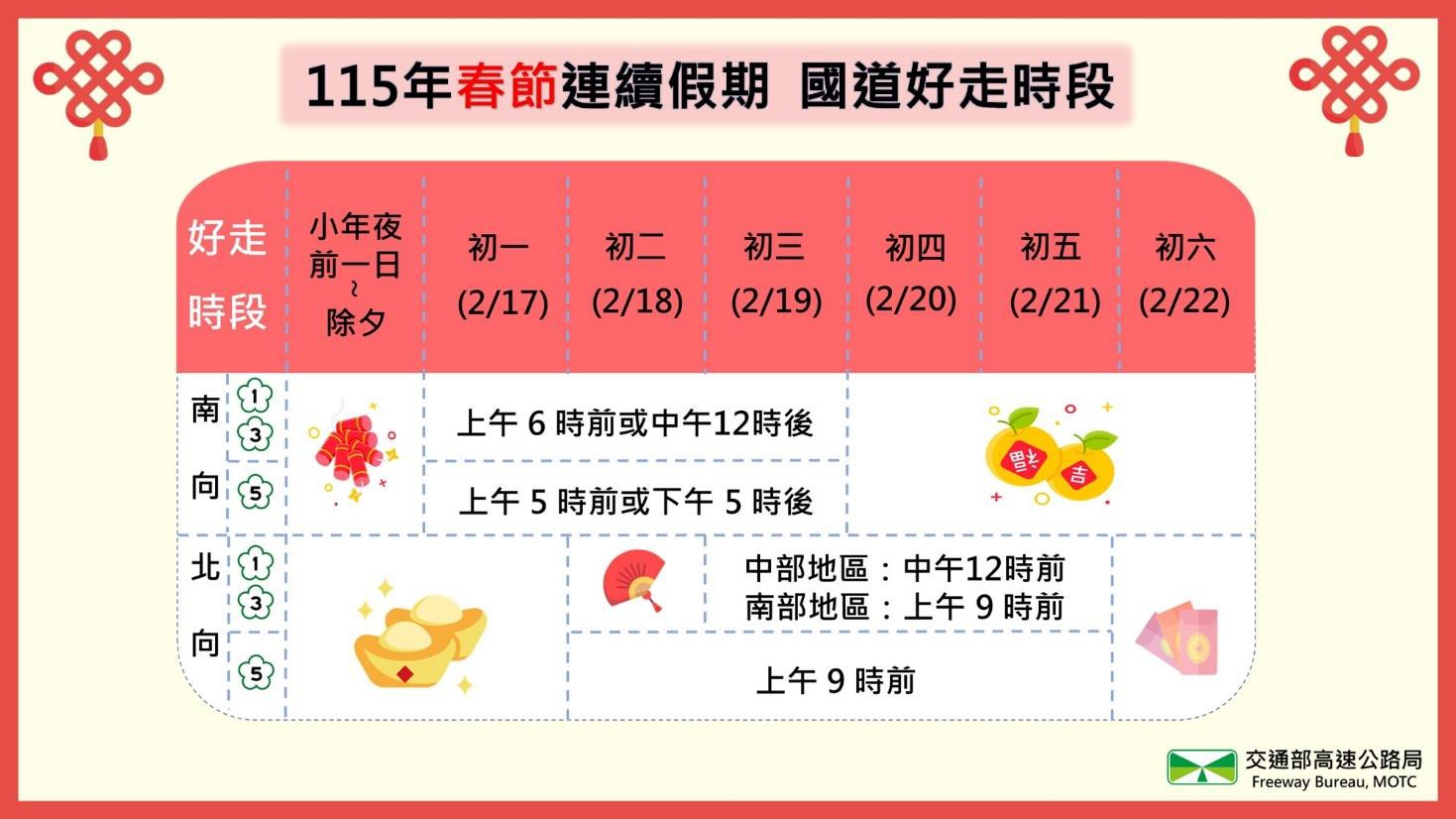 1.2月17日(初一)至2月19日(初三),上午時段南向車流量大,桃園、新竹及彰化瓶頸路段易有壅塞情形。建議用路人早上6時前或中午12時後出發。