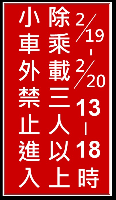 一、國1下營系統至頭份、國3官田系統至竹南,各交流道之北向入口:2月19日~2月20日(初三至初四),每日13至18時。