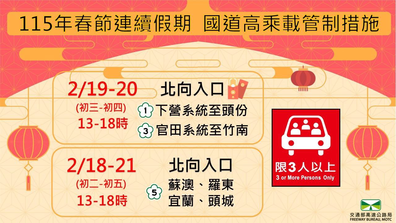 圖3 春節連續假期國道高乘載管制懶人包 (圖為高速公路局提供)