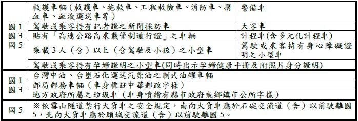 圖4 國道高乘載管制之可通行車種列表 (圖為高速公路局提供)