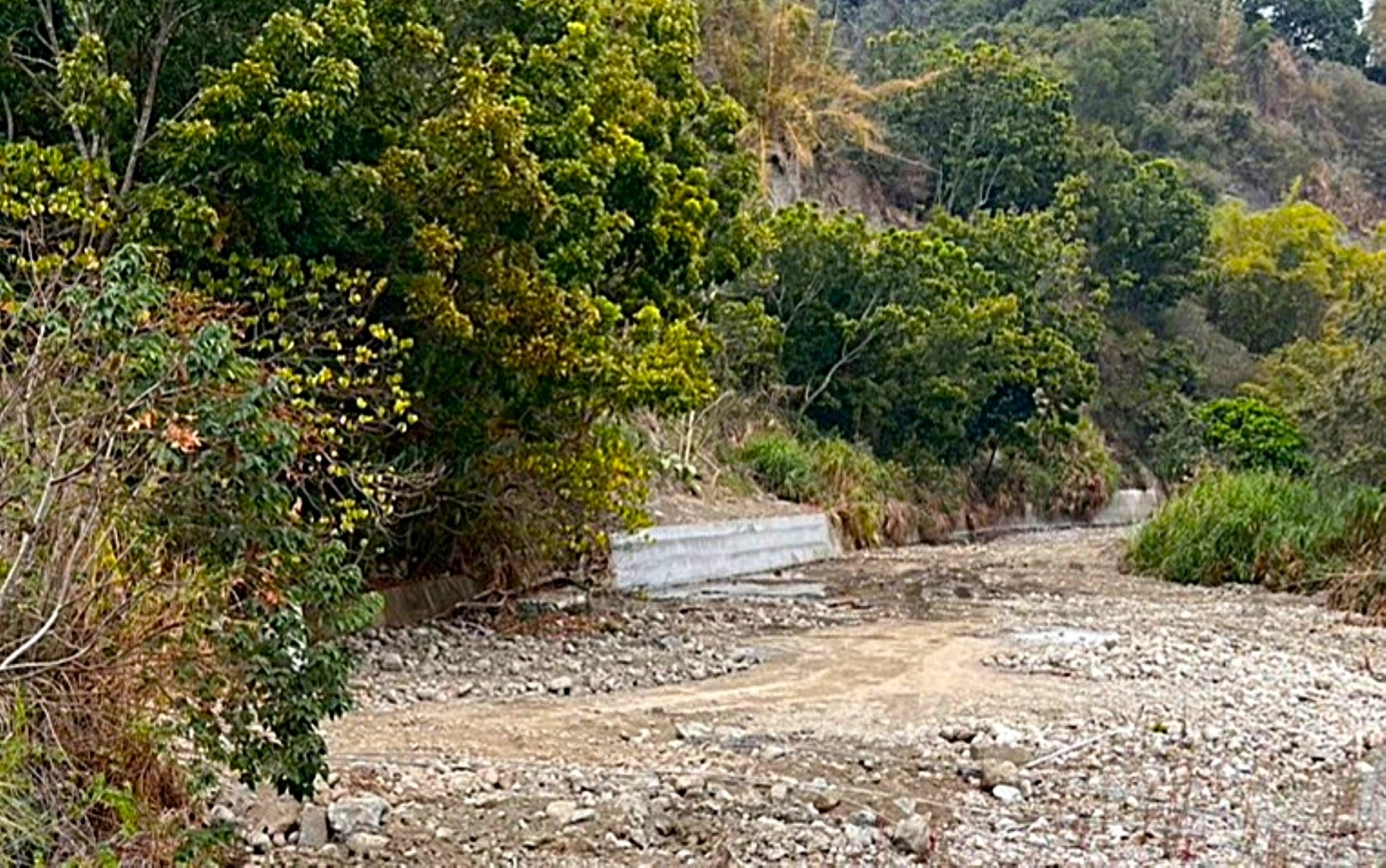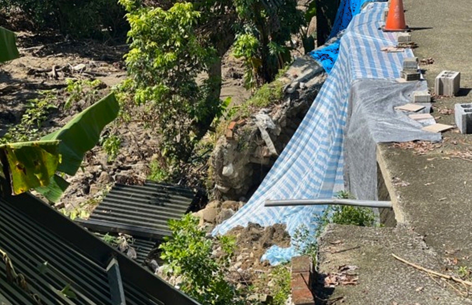 圖1 桐林里北溝小段既有農路旁擋土牆滑動(修復前) (圖為臺中市政府提供)