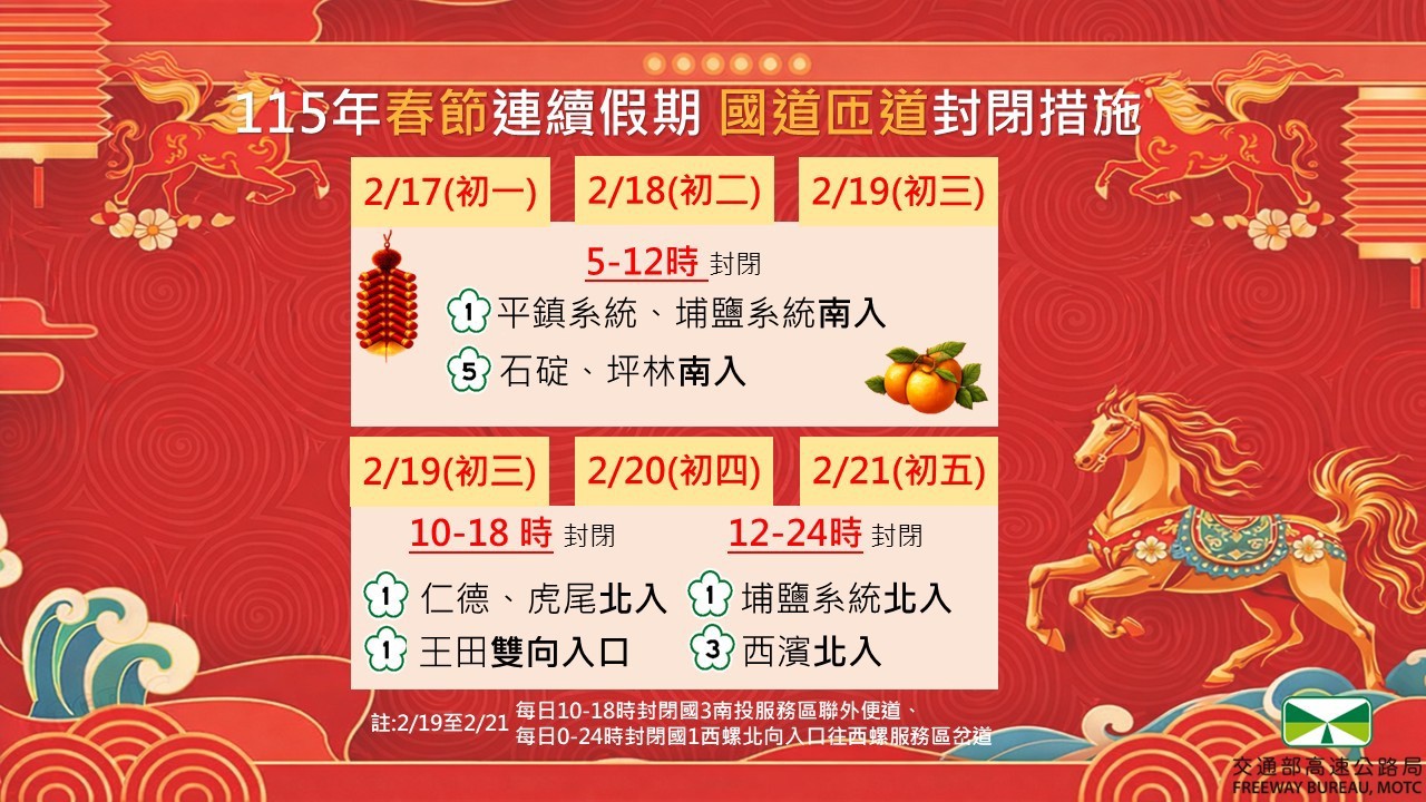 本次春節匝道封閉管制措施,2月17日至19日,時段性封閉國1、國5南向入口匝道,2月19日至21日,時段性封閉國1、國3北向及雙向入口,詳細封閉時段路段參考附圖,請民眾多加留意匝道封閉管制措施並配合。高公局預祝大家春節連續假期快樂、行車平安。