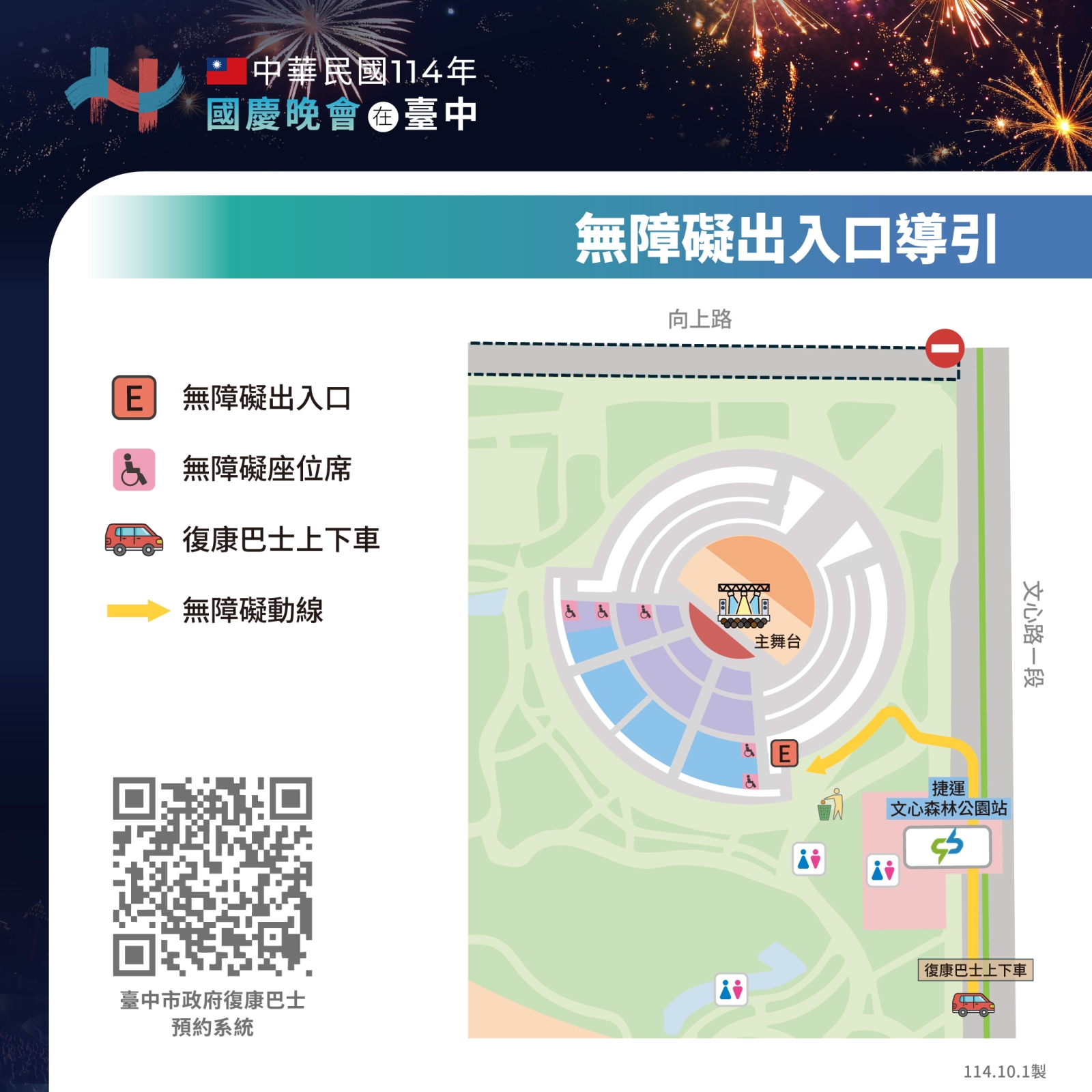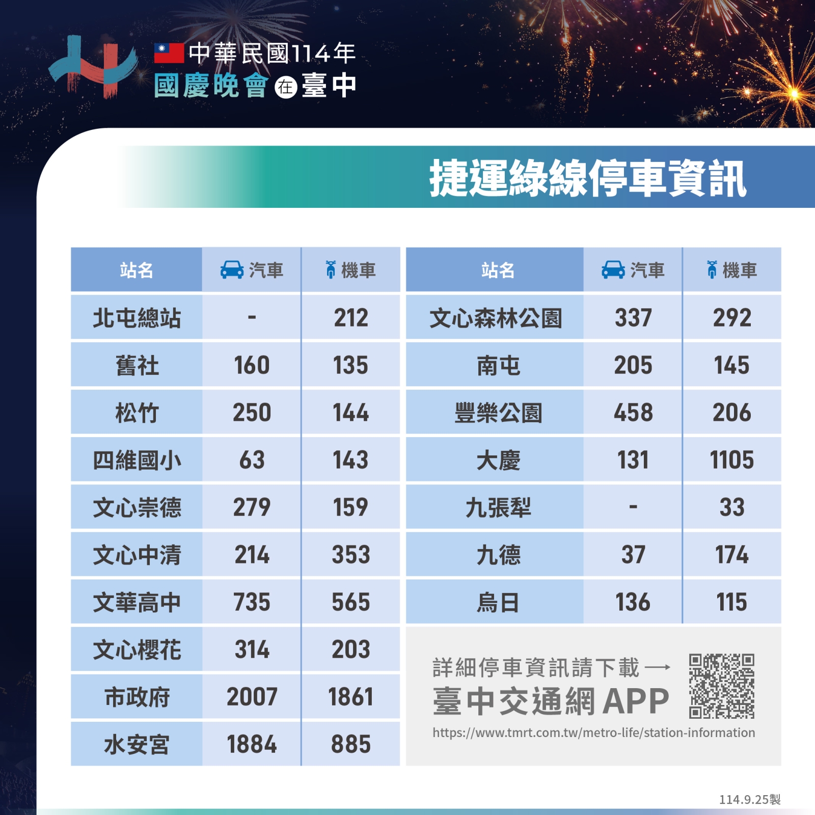 觀旅局補充,為減少交通壅塞情形,鼓勵民眾搭乘捷運、公車、台鐵、高鐵等大眾運輸到晚會現場,10月9日下午2時起,向上路二段(文心路一段至惠文路)將進行雙向封閉,同時段「向上路與惠文路口」(文心森林公園側)公車站牌取消停靠,提醒民眾可至鄰近公車停靠站搭乘。另10月9日全日文心森林公園路邊停車格(含機車格)、惠文停車場、文心森林公園附設停車場(含機車停車區)實施淨空管制,公園內YouBike站點暫停借還,相關交通管制措施將於10月10日0時起全面恢復。