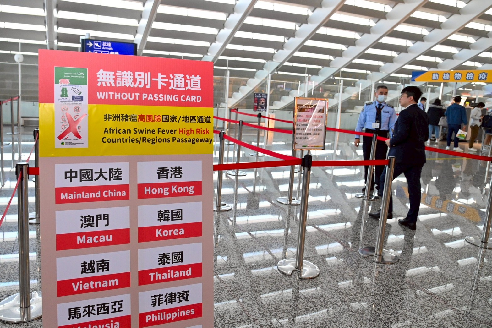 卓院長表示,針對進口貨品、快遞貨物、郵包、旅客行李等,政府採取最嚴謹的邊境檢疫措施,一律加強檢查,並從三個面向加大力道:第一、強化檢查戰力,包括增加手檢區人力、擴增檢疫犬數量,以及增加X光機設備,以提升通關效率並避免人潮壅塞,包括桃園、臺中、小港機場,凡有行李及人員出入地方,均強化全線人員戰鬥力。第二、提高全面查驗比例,以「零信任、零容忍」為原則,對於所有入境貨品「零信任」,進行全面查驗;檢查過程「零容忍」,不容任何疏忽。第三、防線向前延伸,從源頭阻絕,針對入境後投入畜牧業的移工,加強鞋底清消措施,落實「層層守護、關關查驗」,減輕後端防疫壓力。