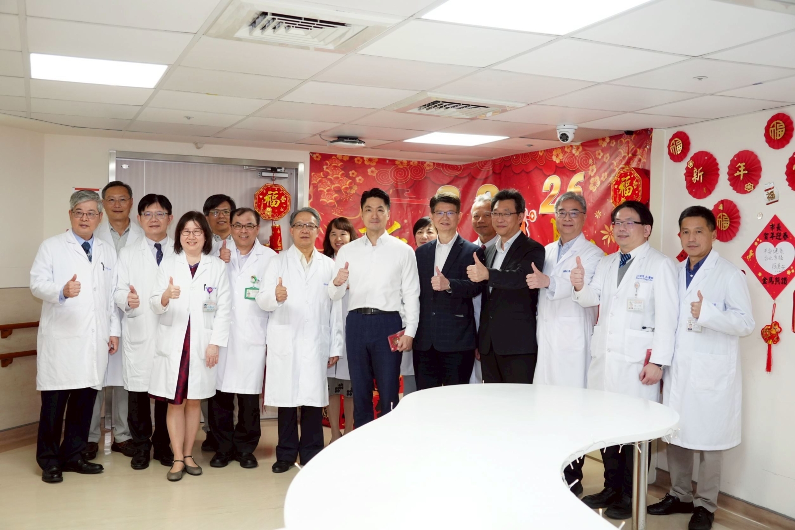 臺北市長蔣萬安今(13)日於春節前夕,前往臺北市立聯合醫院忠孝院區慰勞醫護人員,發送紅包給忠孝院區各單位同仁,並與護理站機器人互動、與大家合影留念。