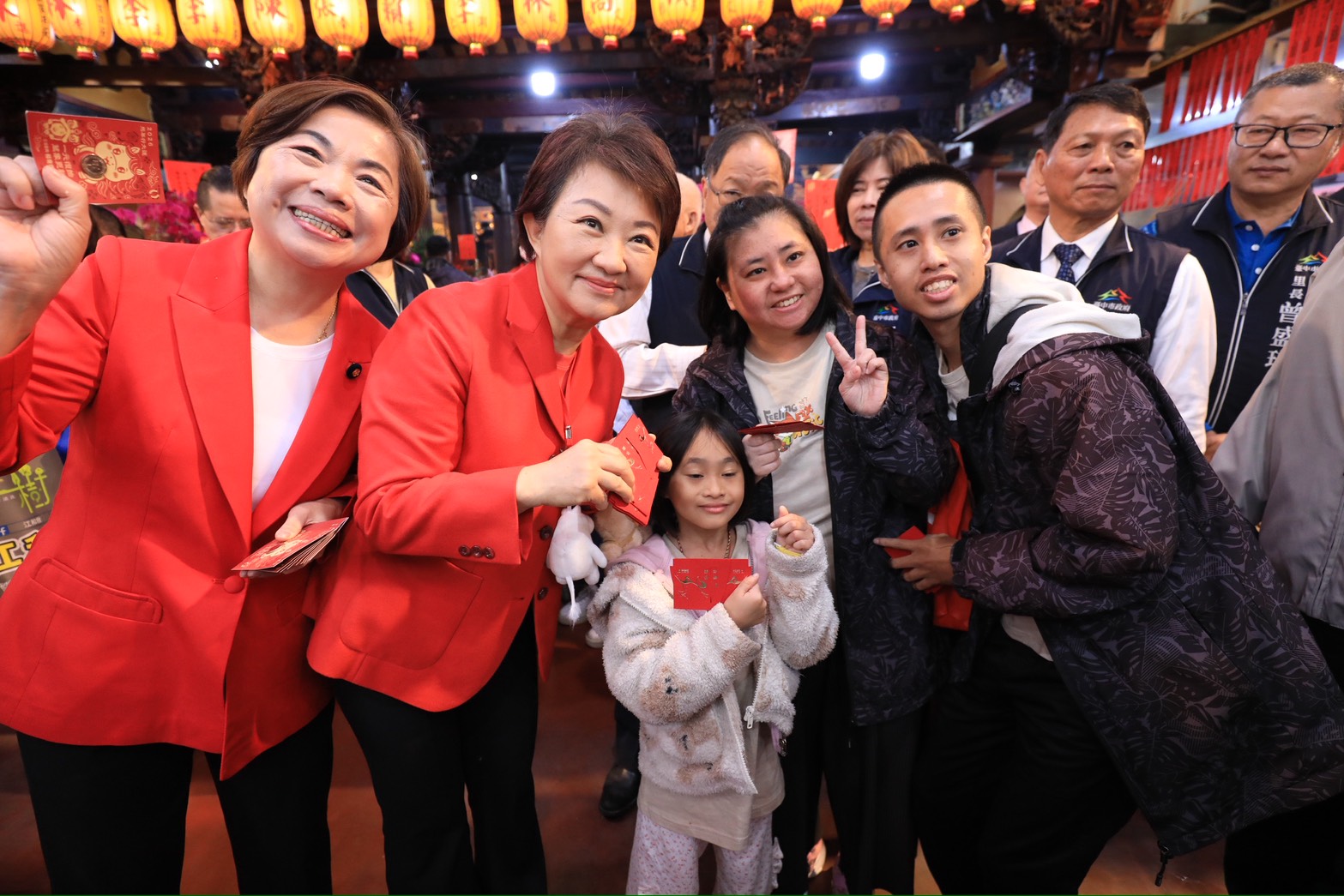 喜迎金馬年!大年初一台中市長盧秀燕一早展開宮廟走春行程,接連前往大里區七將軍廟、西屯區永安宮、潭子區潭水亭及龍井區龍泉岩為市民參香祈福,並發送「馬到金來」小紅包分享新春喜氣。現場民眾大排長龍,甚至有民眾昨晚11點就來排隊,只為了搶得新春好彩頭。盧市長除了向市民拜年祝賀外,也向神明祈福許下三個心願:期盼國泰民安、市政昌隆、廟宇香火鼎盛,迎接福兆一整年。