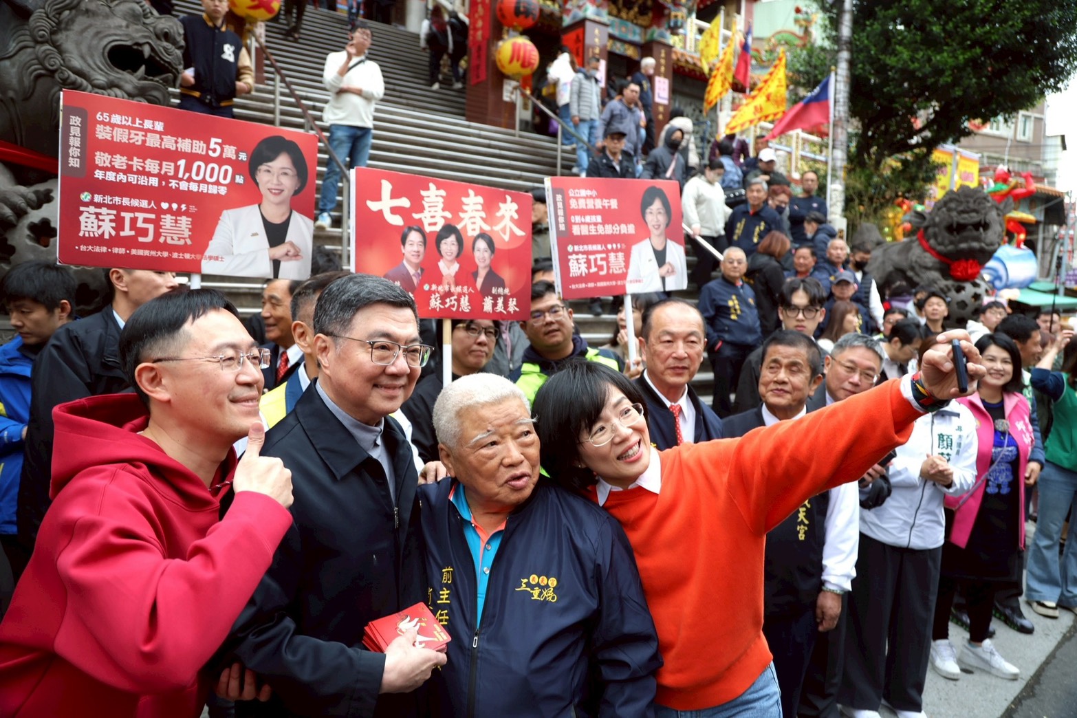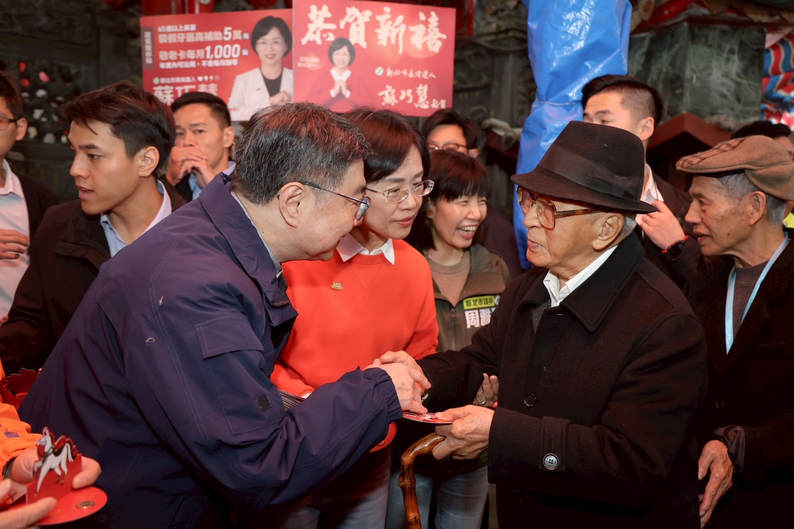 18日為農曆大年初二,行政院長卓榮泰下午偕同李慧芝發言人分別前往新北市汐止濟德宮及三重義天宮參拜祈福,祈求國家風調雨順、國泰民安,並發送總統賀歲福袋向在場鄉親拜年,祝福大家新年快樂,現場湧入許多排隊領取福袋的民眾,人潮絡繹不絕,充滿熱鬧歡樂的春節氣氛。