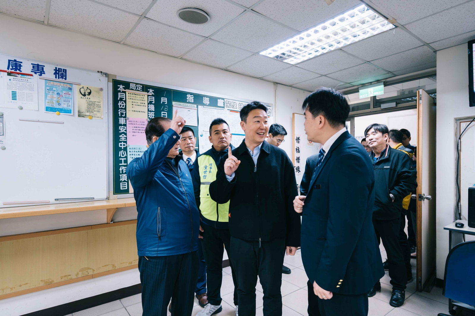 陳部長在運轉室仔細聽取班表系統與列車調度的說明,關切春節期間班次安排是否充足,並詢問同仁輪班調配與工作強度,也進一步了解車輛維修及檢查流程,肯定技術人員嚴謹細心的態度。