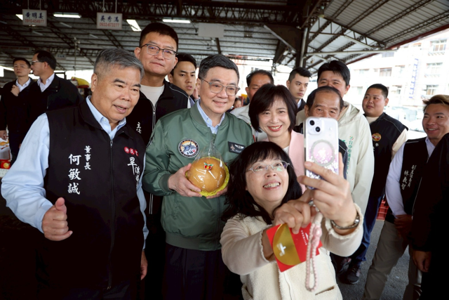 今(20)日年初四是迎財神、補財庫的日子,行政院長卓榮泰偕同李慧芝發言人及何欣純立委前往臺中市豐原武德宮及東勢東聖宮參拜祈福,祝福家家戶戶賺大錢、大大小小都平安。現場也湧入許多排隊領取總統福袋的民眾,人潮絡繹不絕,希望能夠沾滿喜氣、獲得好運。卓院長此行也至東聖宮旁的東勢區農會果菜市場向攤商拜年並發送賀歲福袋,祝福大家新年快樂,攤商也回贈水梨給院長,並與院長合影留念。
