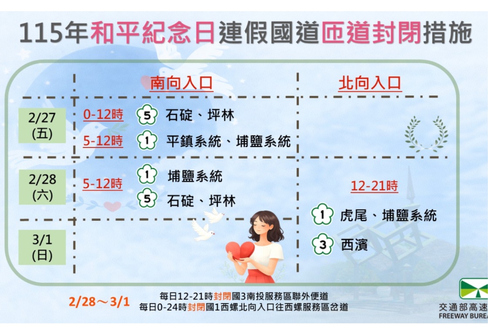 115年和平紀念日連假匝道封閉管制措施,2月27日至28日,時段性封閉國1、國5南向入口匝道,2月28日至3月1日,時段性封閉國1國3北向入口匝道,詳細封閉時段路段參考附圖1,請民眾多加留意匝道封閉管制措施並配合。高公局預祝大家連續假期快樂、行車平安。