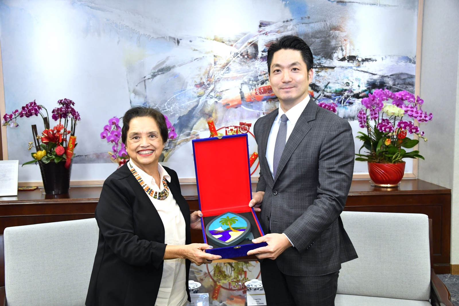 蔣市長最後致贈象徵臺北地標的101木製音樂盒予古蕾露總督,再次歡迎訪團來訪臺北,並表達誠摯祝福與長久紀念。古蕾露總督則回贈關島在地特色紀念品,並誠摯邀請蔣市長未來有機會造訪關島。