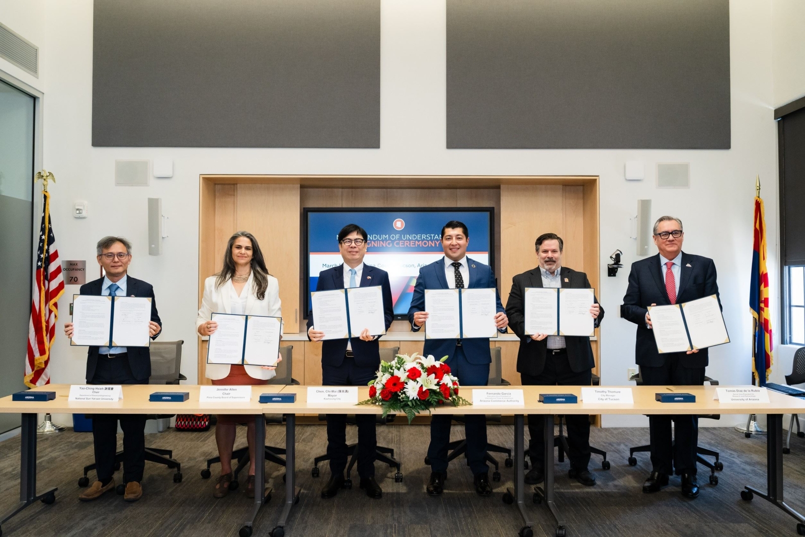 繼與亞利桑那州政府、日本熊本縣簽署三方經濟交流促進備忘錄(MOU)後,高雄市長陳其邁馬不停蹄率領市府團隊,前往亞利桑那州第二大城、也是南部最大城市「光學之谷」土桑市(Tucson),與亞利桑那州商務廳、皮馬郡府、土桑市政府、亞利桑那大學(University of Arizona)及國立中山大學共同在當地指標性歷史建築皮馬郡歷史法院共同簽署「六方半導體生態系與全球人才夥伴合作備忘錄」。陳其邁指出,台美日確立半導體戰略三角後,此次拜會暨簽署六方MOU更象徵高雄與美國產官學界的合作,由州政府層級進一步落實至地方政府與學術機構,正式開啟跨國人才培育的合作契機與實質對接。