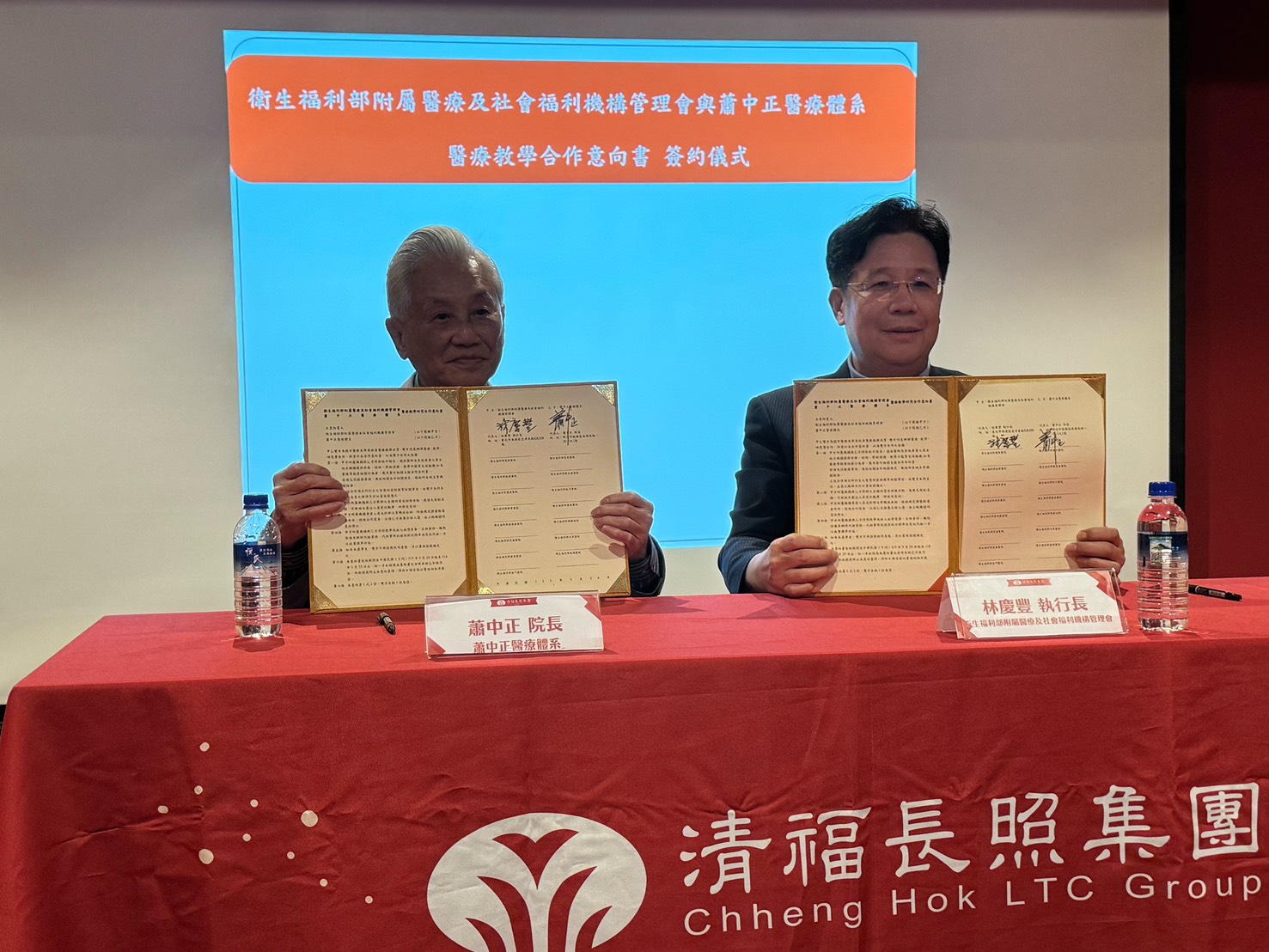 因應我國邁入超高齡社會,衛生福利部部立醫院已經長照司核定,申請計畫補助之住宿式長照機構共16家、布建1,938床,總預算高達26.2億元,衛福部附屬醫療及福利機構管理會林慶豐執行長今(24日)率領部醫團隊,前往清福長照集團與蕭中正醫療體系所屬機構參訪,並簽署合作意向書,深化醫療與長照跨體系合作。