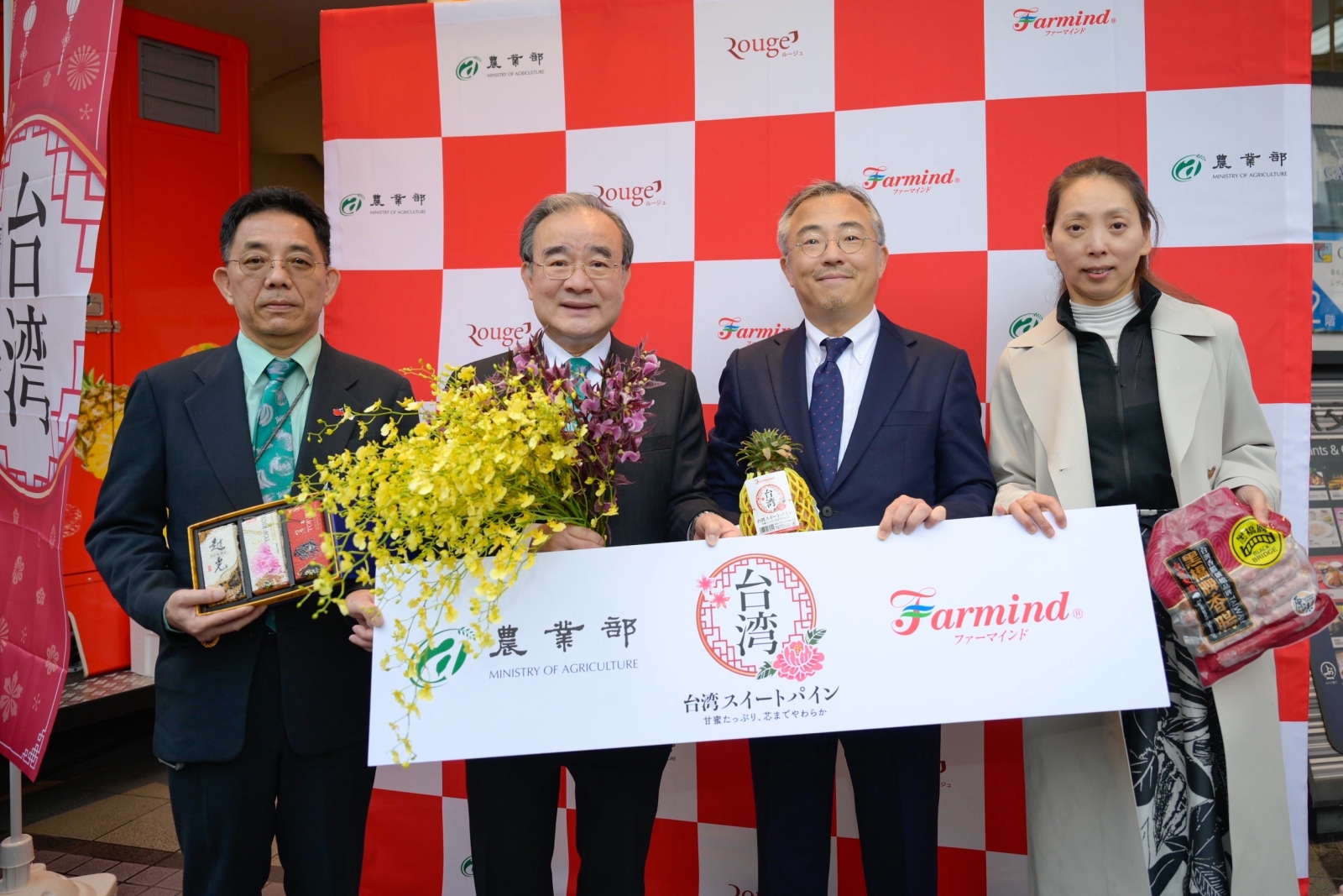 農業部胡忠一政務次長今(4)日在日本東京出席「臺灣祭(台湾フェア)」,活動由農業部攜手日本蔬果通路龍頭「Farmind株式會社」及「Rouge Japan(ルージュジャパン)株式會社」共同主辦,在東京有樂町交通會館前廣場,以充滿活力的「露天餐車」形式,將臺灣優質的金鑽鳳梨、產銷履歷米、經典品牌香腸及精緻花卉等農產品形象,深深植入日本消費者心中與日常生活。