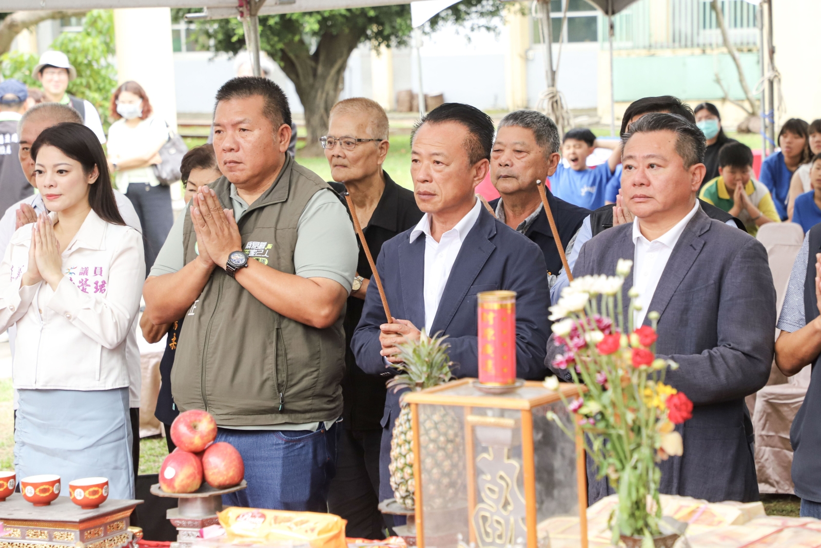嘉義縣政府持續推動特色公園遊戲場建置計畫,今7日舉行六腳鄉蒜頭國小附設遊戲場工程動土典禮,縣長翁章梁及副議長陳怡岳等人出席,為工程祝禱祈福。