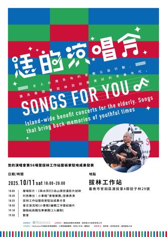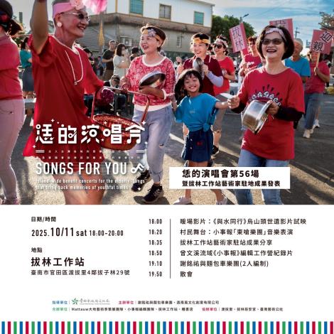 活動於當晚6點開始,「恁的演唱會」特別邀請金曲歌王謝銘祐與麵包車樂團吉他手王東昇,以歌聲吟唱溪流與農事,帶來最貼近土地的音樂饗宴。藝術家許怡慈將供應採集嘉南大圳流域的野草,熬煮獨具風味的「淺山溪畔野草茶」,以味覺連結自然;現場也將試映文資處最新製作影片《與水同行》,以影像呈現嘉南大圳的世界遺產潛力價值。此外,拔林工作站藝術家也將分享駐站成果,並播映曾文溪流域《小事報》於今夏營隊的紀錄片,展現溪流與地方連結的多元面貌。
