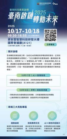 論壇將於10月17日 (五) 及10月18日 (六) 的上午9時30分至下午16時55分舉行,地點為資安暨智慧科技研發大樓國際會議廳A121 (臺南市歸仁區歸仁十三路一段6號),報名連結如下:https://events.businesstoday.com.tw/2025/TainanTechnology/,誠摯邀請產業界、學界、公協會與市民朋友踴躍參加,攜手見證AI與科技如何引領臺南產業邁向新世代。