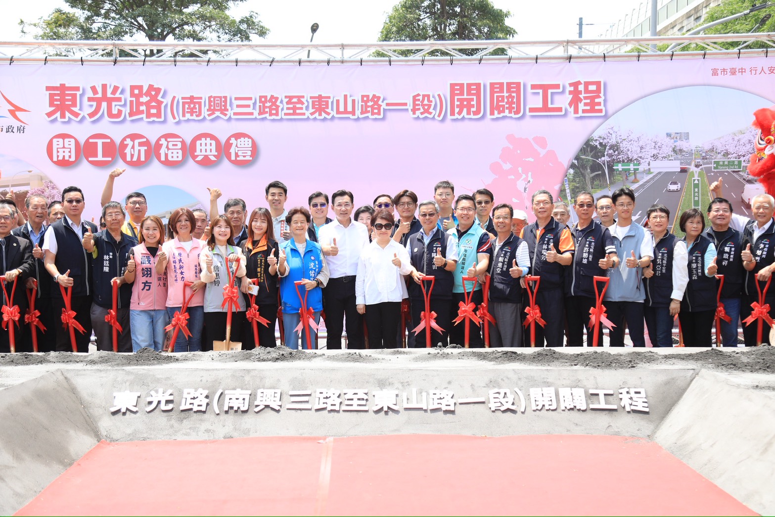為改善台中北屯交通瓶頸、完善區域路網,市長盧秀燕積極推動「東光路計畫道路開闢計畫」,繼去年完成第一階段松竹路一段至南興三路及東山路一段至東光路892巷等路段並發揮分流效益後,今(13)日正式啟動第二、三階段「南興三路至東山路一段」工程,盧市長表示,面對人口持續成長與交通需求增加,市府積極推動重大道路建設,並結合治水、污水及管線地下化等工程,全面提升北屯地區生活機能與都市品質。