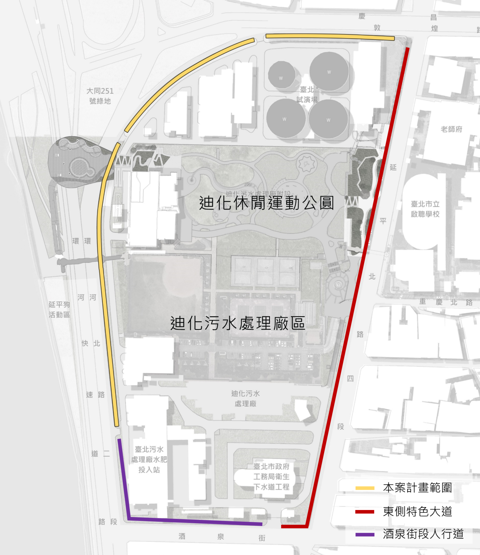 為讓民眾進出迪化污水處理廠附設休閒運動公園動線更加順暢,臺北市政府工務局衛生下水道工程處推動「公園內升降設施及人行改善工程」,規劃於公園東側入口接待廣場增設電扶梯,並同步整修廠區西側及北側周邊人行道,工程預計於今(115)年12月開工,目標於明年9月完工,盼減輕長者、親子及行動不便者進出公園的負擔。