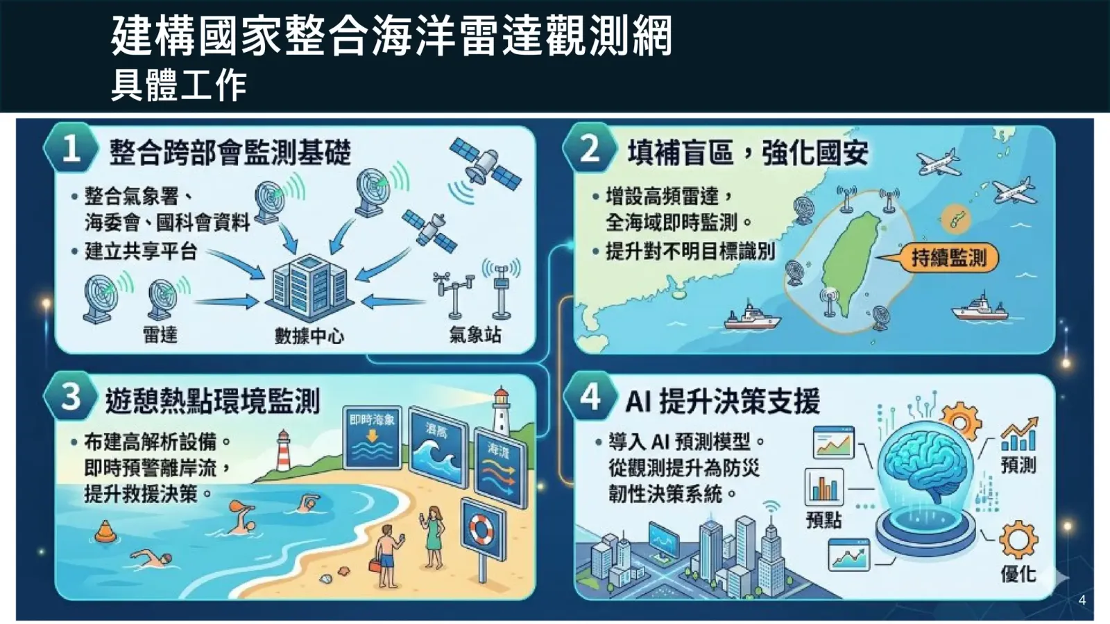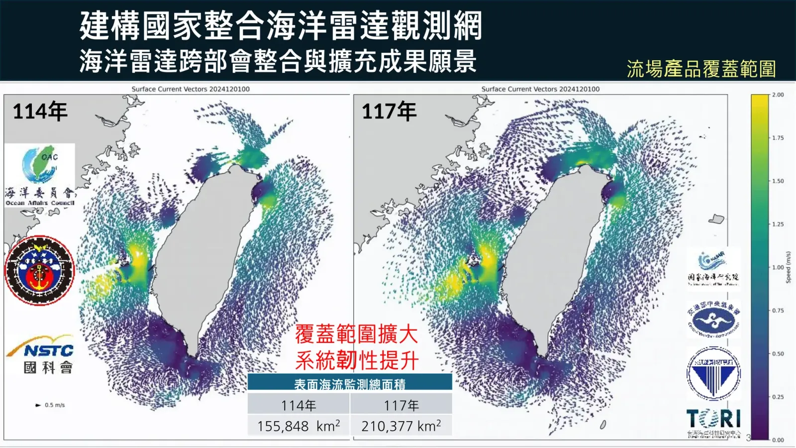為填補關鍵海域監測盲區,提升系統韌性,卓院長強調,除覆蓋臺、澎、金、馬主要活動海域外,更應針對彭佳嶼海域等戰略要地加強站網覆蓋及互補,提供全天候更新海域環境動態資訊。