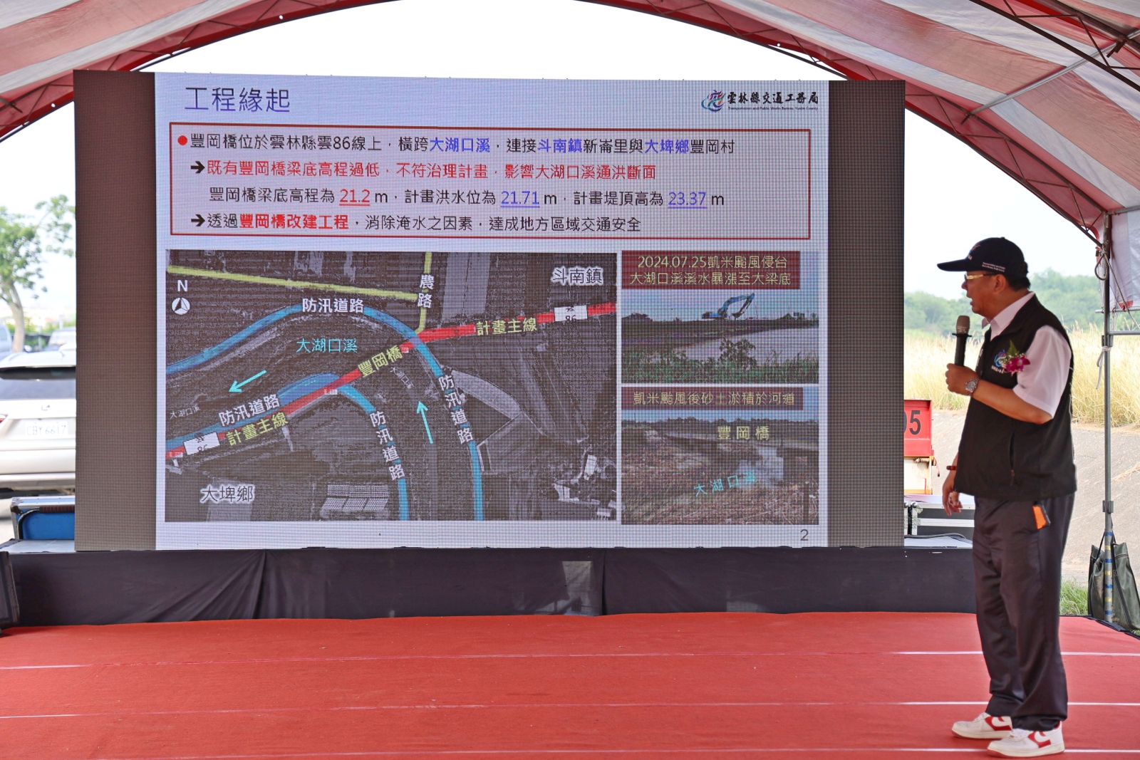 斗南鎮長沈暉勛表示,豐岡橋位在大湖口溪下游與虎尾溪交界處,每逢大湖口溪上游大雨,常造成下游段豐岡橋鄰近斗南鎮新崙里跟大埤鄉豐岡村村里民生命財產危險。感謝縣政府、第五河川分署、張嘉郡委員幫忙爭取豐岡橋改建工程,希望完工後,可以改善當地淹水困擾。