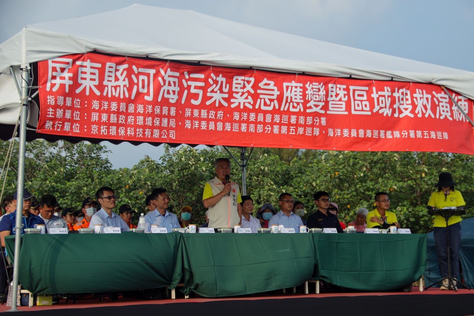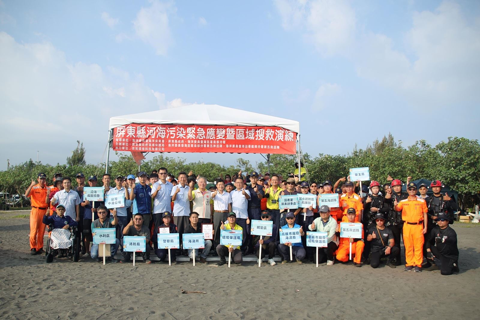 為強化海洋與河川污染災害應變能力,屏東縣政府於10月8日在東港鎮海公園舉辦「114年河海污染緊急應變暨區域搜救演練」,除動員縣府相關單位,並結合海巡署、國有財產署、中油公司、東港鎮公所與漁會、環保艦隊以及臺南市環保局與高雄市海洋局等共19個單位參與,展現中央與地方、跨縣市聯防的應變整合能力。
