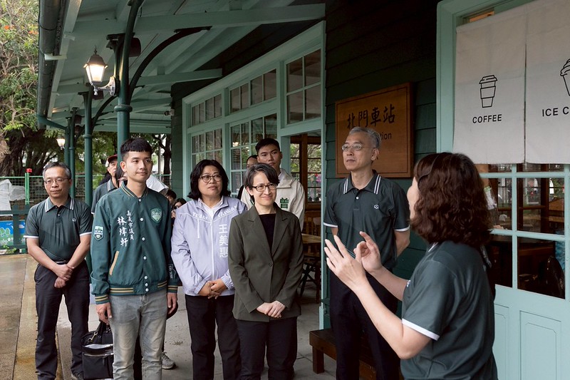 隨後,副總統前往市定古蹟「北門驛」,參觀以阿里山特有紅檜打造的舊車站建築,瞭解阿里山森林鐵路起點及貨運集散地的歷史風貌。副總統也接續拜訪「檜意森活村」,參觀以日式傳統工法修復的舊日式官舍群,實地感受文化資產保存與再利用的成果,並體驗當地獨具特色的木都風貌。