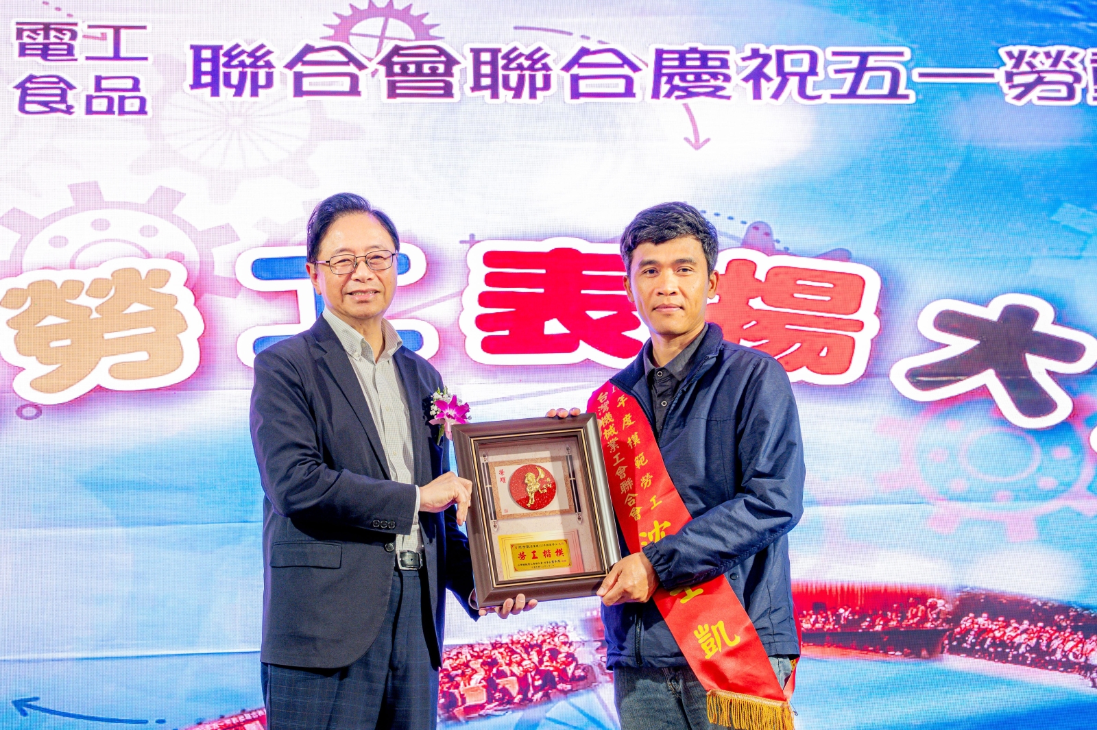 桃園市長張善政昨(24)日下午前往中壢區,出席「台灣機械、電工、紡織、食品業聯合會慶祝五一勞動節聯合表揚活動」。張市長表示,五一勞動節將至,今日特別表揚110位模範勞工,並向所有辛勤付出的勞工朋友致上誠摯敬意。