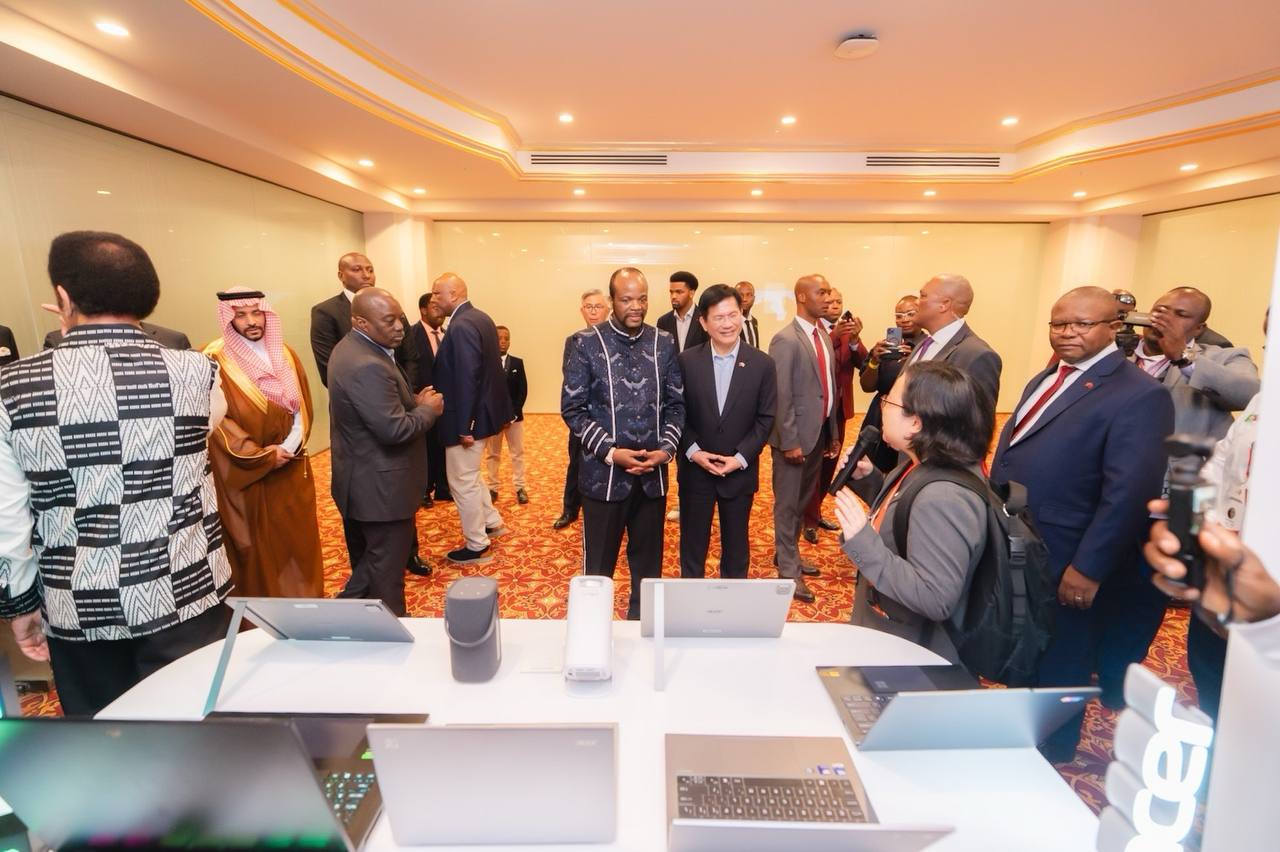 史王恩史瓦帝三世與總統特使林佳龍在「國際會議中心」參觀台灣廠商宏碁的資通訊科技產品展示(圖為外交部提供)