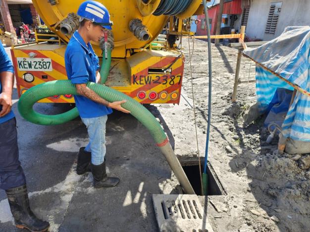 臺南市水利局長邱忠川表示,高壓吸泥車利用機械原理,可以吸取及沖洗方式迅速清理下水道與側溝淤泥,快速恢復市區排水功能。水利局響應黃偉哲市長發揮同島一命、人溺己溺之精神,再次調派2輛14噸高壓吸泥車及2部貨車,另有工作人員8員。於國慶連假期間,犧牲休假馳援花蓮,加入災害應變中心統一調度,支援團隊現已挺進靠近馬太鞍溪堤坊之武昌街一帶,清理巷弄內狹窄側溝淤泥,加速排空側溝,也配合水電志工協助,恢復民眾用戶排水順暢,早日回歸正常生活。