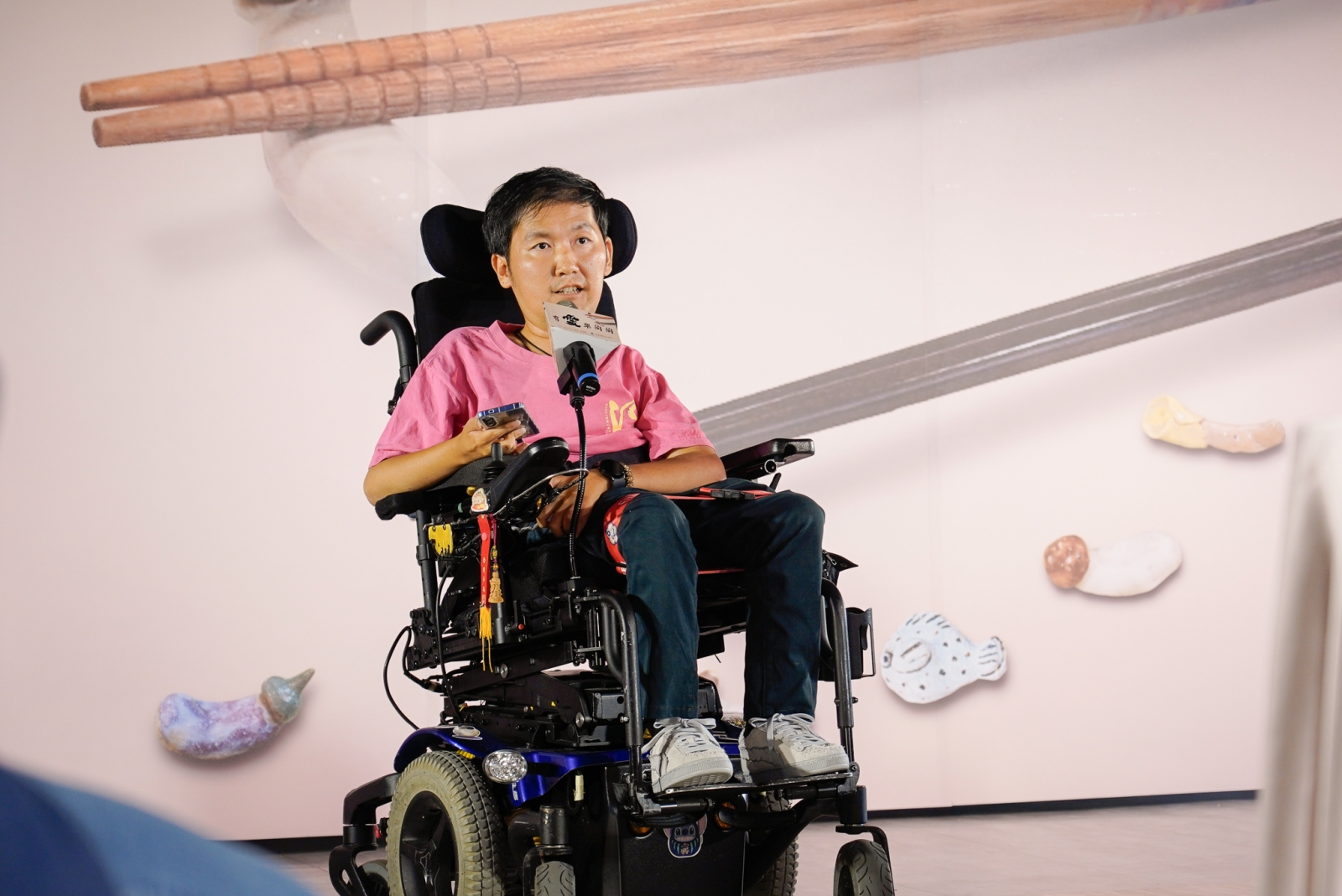 38歲的院生代表張孜維,罹患先天性肌肉萎縮症,自5歲起入住教養院。他以不屈精神書寫人生傳奇─榮獲第二十九屆「金鷹獎」身心障礙楷模,全國僅十位得主;更曾拿下總統教育獎、台北市長獎,現就讀國立體育大學博士班。孜維同時是台灣地板滾球國手,屢次代表台灣征戰國內外賽事奪冠。這次他設計的「蝴蝶筷架」象徵突破與重生,把生命力注入日常器物。他分享,學習陶藝讓自己體悟「慢慢來也沒關係」的價值,只要願意嘗試,就能留下努力的痕跡。