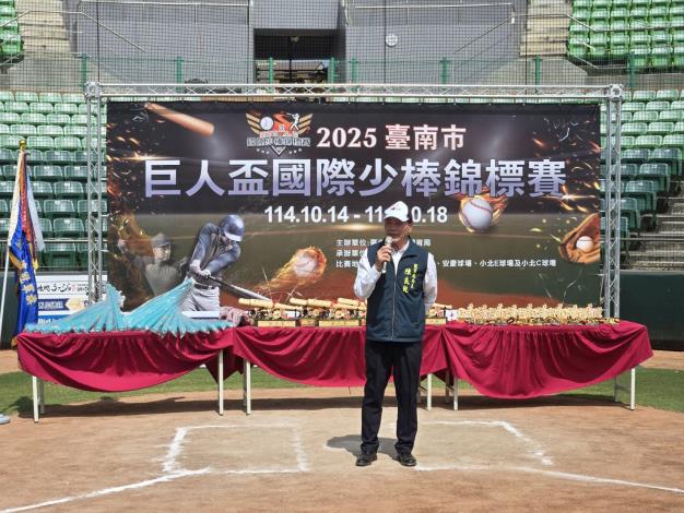 2025臺南市巨人盃全國少棒錦標賽於10月14日至18日在亞太國際棒球訓練中心少棒主球場、少棒副球場、文小52棒球場、小北C棒球場及小北E棒球場等5處場地熱鬧開打,本次共有13縣市及韓國京畿道共40支隊伍參賽,今(14)日在亞太少棒主球場舉行開幕儀式,臺南市政府體育局陳良乾局長代表市長擔任開球嘉賓,誠摯歡迎來自全國各地的選手,除鼓勵各隊選手大展實力獲取佳績外,也勉勵臺南小將們全力以赴,並期許各球隊延續巨人精神,遇強則強,互相切磋球技,大展球隊實力,爭取佳績。