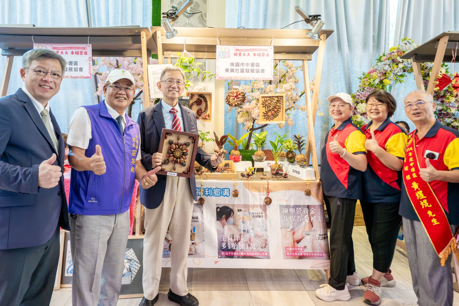 王副市長與桃園市中壢區東興社區發展協會攤位開心合影 圖1