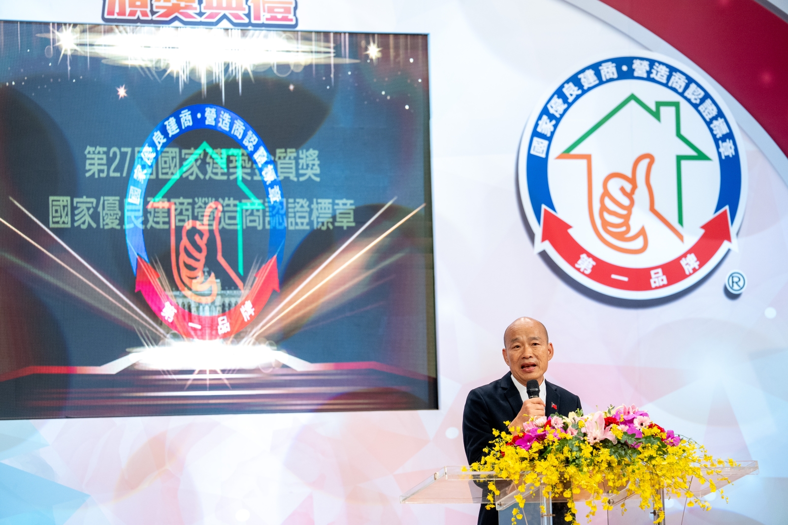 韓國瑜院長(16)日晚間出席第27屆國家建築金質獎暨國家優良建商營造商認證標章頒獎典禮。現場貴賓包含中華民國國家企業競爭力發展協會鍾佳濱主任委員、監察院李鴻鈞副院長、內政部國土管理署吳欣修署長、內政部建築研究所王榮進所長以及建築領域產、官、學、研各界代表等貴賓出席盛會。