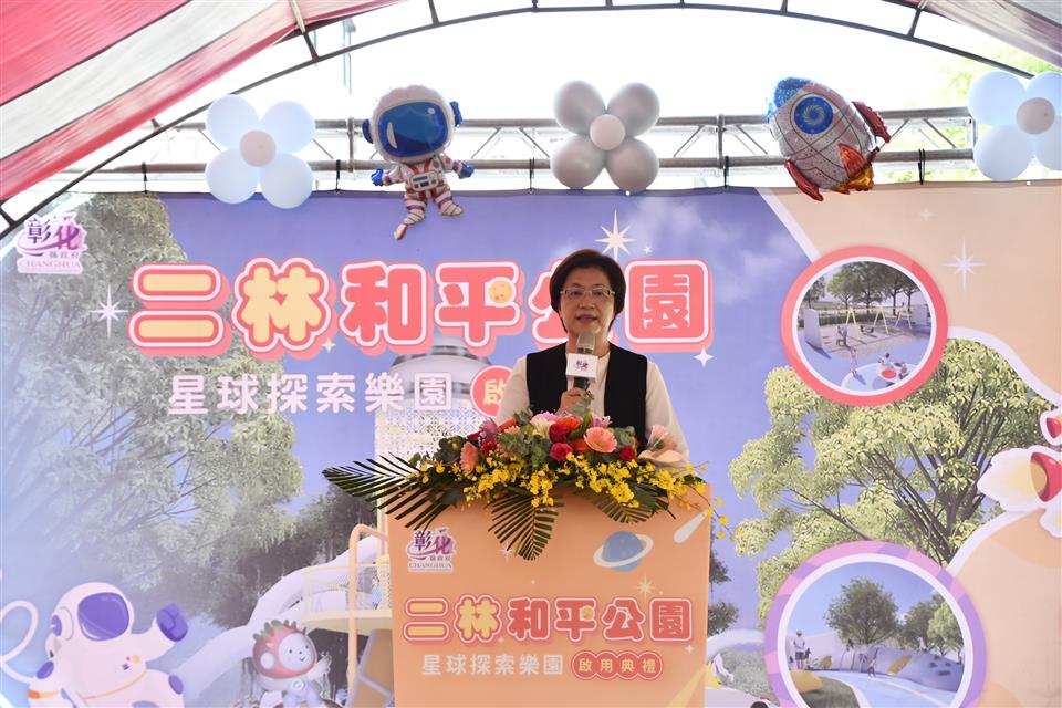 彰化縣政府為推動「一鄉鎮一特色公園」,於二林鎮選定和平公園辦理環境設施全面改善。去(113)年11月動工,今(18)日上午舉行啟用典禮,縣長王惠美、二林鎮長蔡詩傑及各級民代與會。王縣長表示,感謝中央和議會的支持,總共投入3,300萬元,內政部補助350萬元,縣府在議長謝典霖及所有議員的支持下,自籌2,950萬元。和平公園兒童遊戲場佔地超過1,000坪,從二林精密機械園區發想,選擇太空科技為主題,打造成一個「星球探險樂園」,希望為二林鎮再添親子同樂、長幼共享的休憩場域。