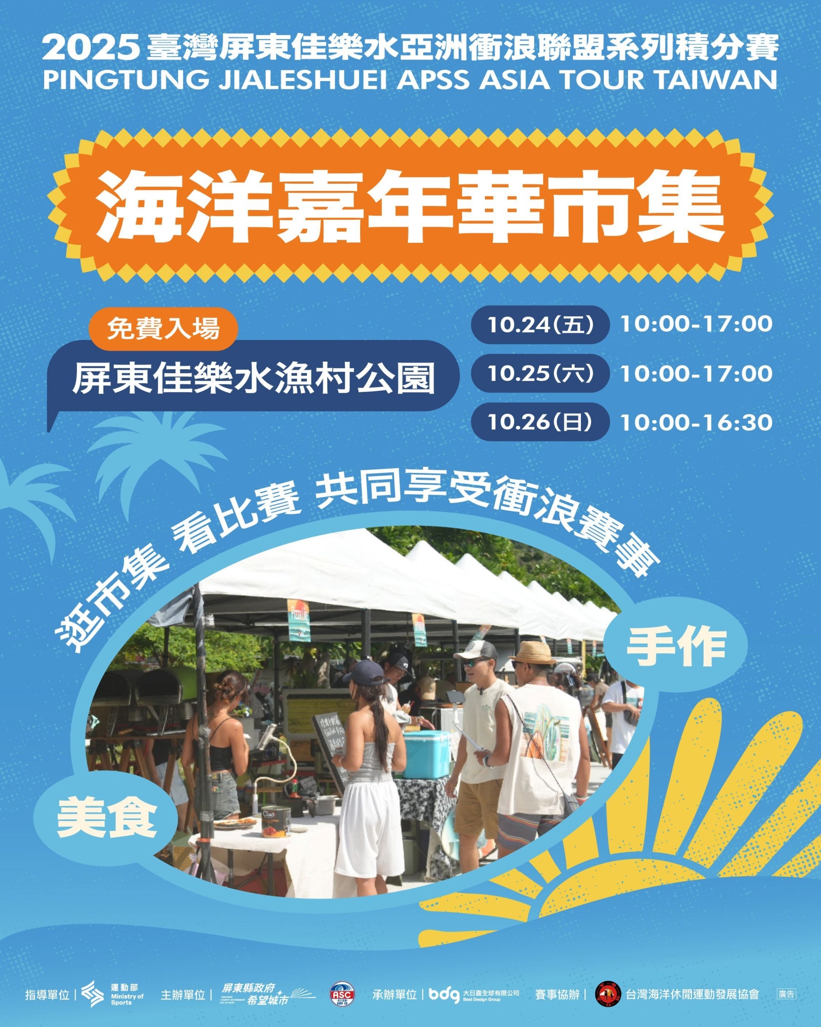 除熱血賽事之外,10月24日至26日上午10時至下午17時,還將於滿州漁村公園登場「海洋嘉年華」活動,串連海洋文化與在地生活,規劃超過30個攤位,包括在地美食市集、南島音樂表演、使用自然材料的手作體驗「構樹皮布製作手作體驗、海神餐桌之海廢食驗室、椰子編織水果籃手作體驗」、SUP龍舟版變裝競速賽、SUP寵物競速賽與衝浪體驗課程等豐富內容,邀請民眾在藍天與浪花間,一同感受屏東佳樂水的陽光熱情。