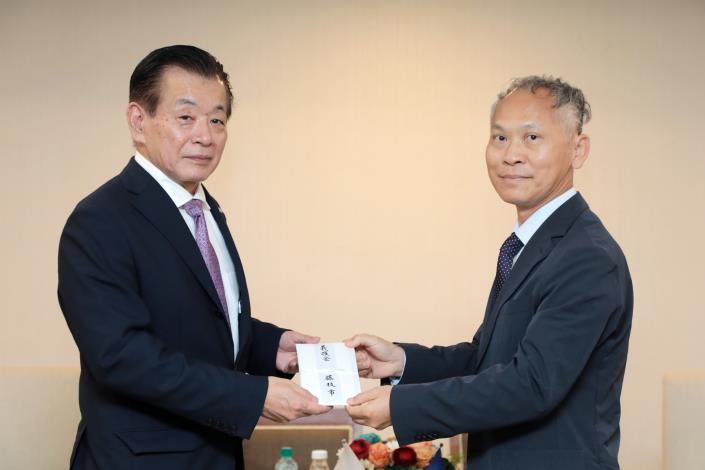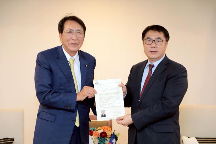 藤田政樹會長(左)轉交白山市長田村敏和信函給黃偉哲市長 圖2