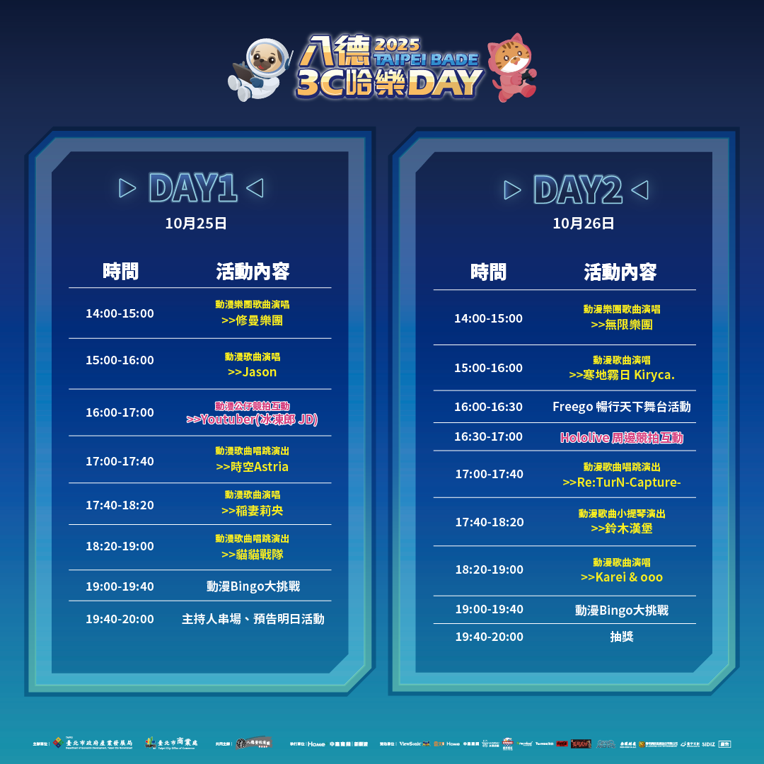 熱愛動漫的夥伴們快到八德資訊商圈集合!「2025八德3C哈樂DAY」活動由臺北市商業處與台北市八德資訊商圈發展協會攜手辦理,自10月4日熱力開跑至今高潮不斷,將持續狂歡至11月2日,活動期間連續3週週末於三創生活園區-八德中心廣場接力推出3C電玩、二次元及動漫主題展演。本週末10月25日及26日由最熱血沸騰的「動漫週」燃燒八德商圈,現場與超人氣動漫《我的英雄學院》FINAL SEASON視覺拍照牆合照打卡就能領取限量好禮;活動更邀請玩具界人氣YTR「冰凍郎」帶來動漫好物競拍,千萬別錯過用超值划算的價格把IP公仔帶回家的機會!此外還有燃到不行的動漫歌曲接連演出,快揪朋友來八德資訊商圈,一起瘋玩穿梭動漫宇宙!