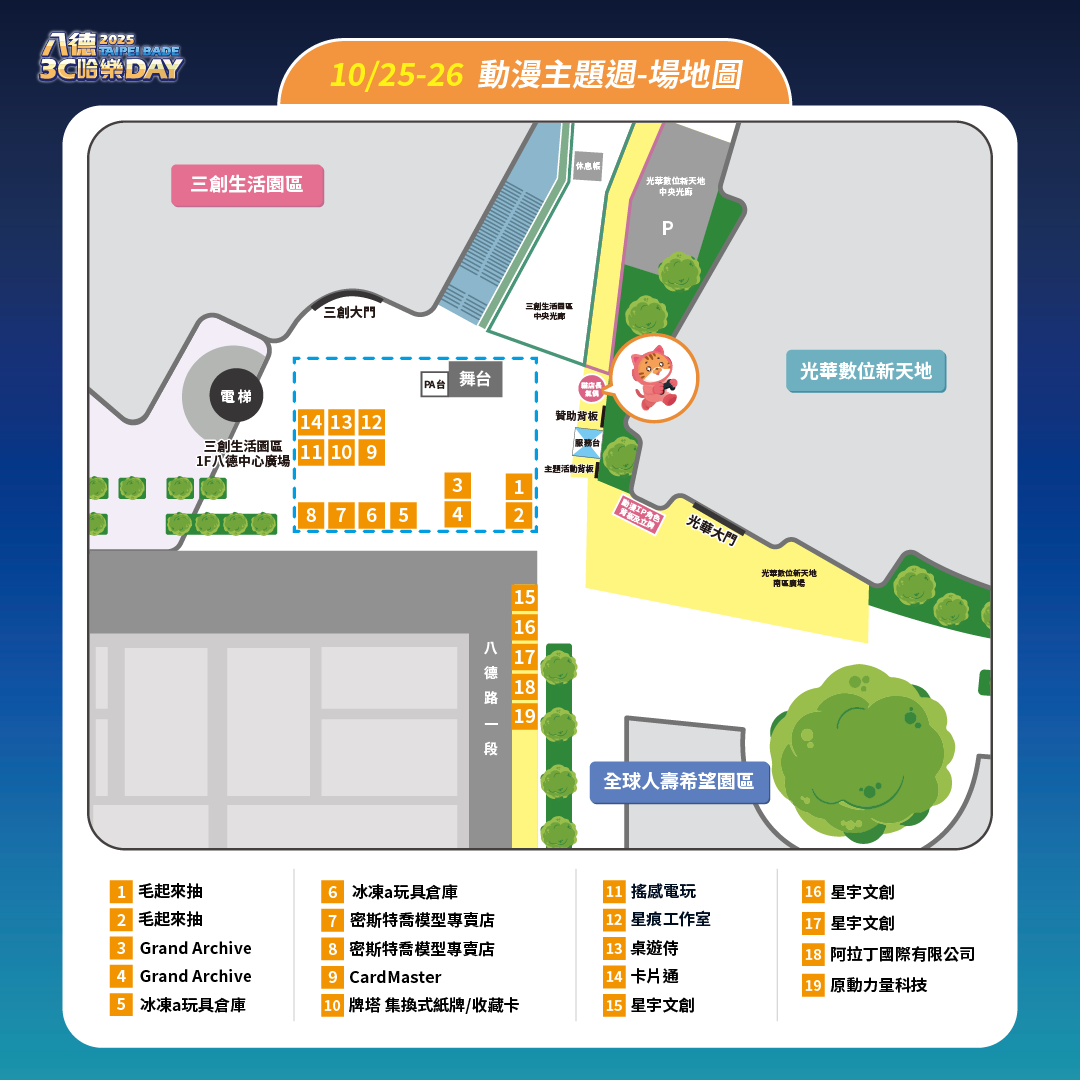 當然,動漫迷最愛的市集攤位也不容錯過!Grand Archive、CardMaster、牌塔 集換式紙牌/收藏卡、卡片通等卡片品牌將展售多款人氣IP收藏卡,現場還設有切磋牌技體驗區,讓玩家隨時展開一場熱血對戰;冰凍a玩具倉庫、密斯特喬模型專賣店、搖感電玩、星痕工作室等品牌更帶來知名的動漫IP公仔、鋼彈模型與Hololive周邊,網紅冰凍郎及喬老師也將親臨現場與大家互動,讓你的收藏魂全面爆發!現場還能體驗阿拉丁國際有限公司的抽卡機與拍貼機、桌遊侍的桌遊試玩、經典的毛起來抽日式搖獎機、星宇文創的動漫週邊與限量福袋或原動力量科技的電輔車試騎,滿滿驚喜等你來開箱!這個週末一起在八德資訊商圈開啟充滿驚喜的動漫尋寶之旅吧!