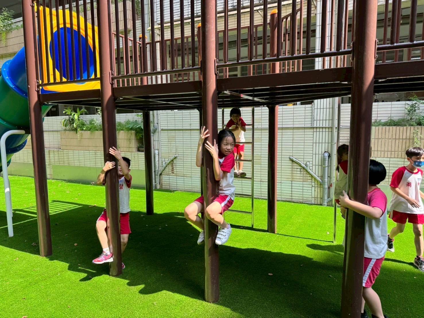 一年級的李同學說:「攀爬攀爬網的時候晃來晃去真有趣!還可以站在高處看大家!跟同學們一起穿梭其間玩躲貓貓時很快樂!」四年級的陳同學和二年級的簡同學同聲表示:「最喜歡直立式的攀爬竿,不論是爬上去或滑下來都充滿了刺激!」,「溜長長的溜滑梯光是想像就很好玩」游同學難掩開心的表達:「整個遊戲場地面鋪設防撞草皮,搭配鮮明活潑的色彩設計,兼具安全與美感。」家長們在學校日看到這一座多功能的共融式遊戲場深表感動,學校更特別裝設了閃亮亮的夜間照明,假日全天和週間晚上7時到9時,開放社區小朋友們盡情玩耍!媽媽們深深認同孩子們能在安全的環境中盡情探索,對身心發展的幫助。