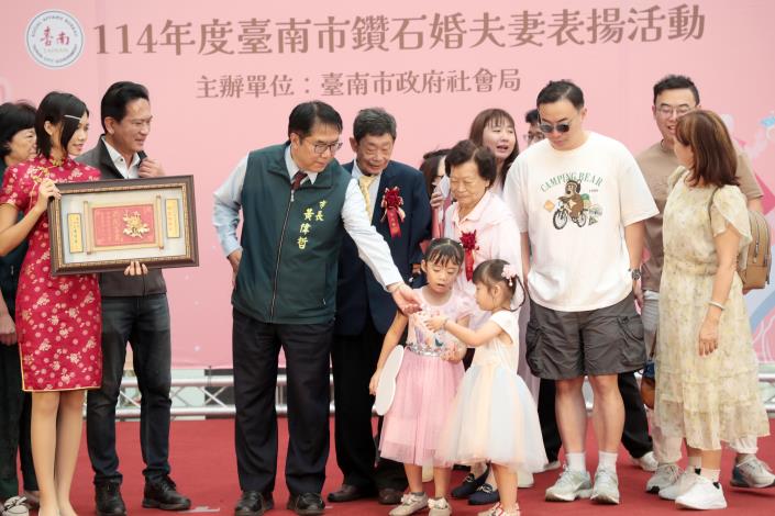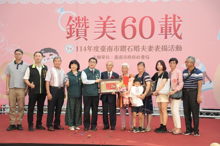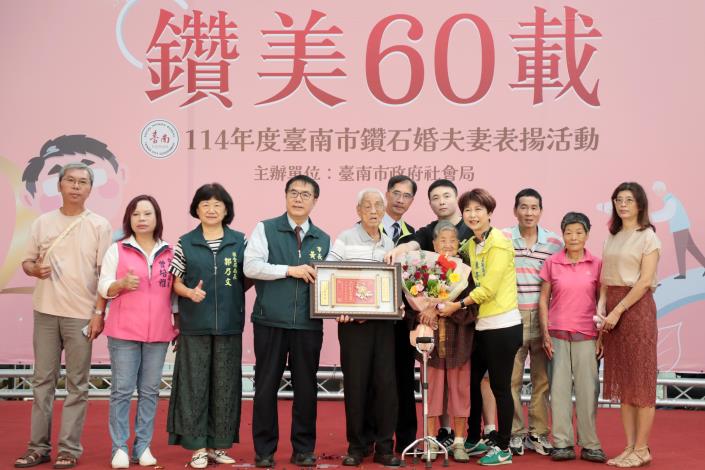 社會局表示,市府今(114)年辦理鑽石婚表揚共表揚70對,首場於10月18日在民治市政中心南瀛堂完成33對夫妻的表揚,要達到鑽石婚的成就,不僅夫妻雙方婚齡要長久,同時也需要長壽健康,才能彼此相伴到老,本次上台受表揚的長者們都是兒孫滿堂,人生的幸福莫過於此。市府未來會持續強化對高齡人口及各年齡的家庭照顧政策,讓每位老人、兒少、婦女、身障等市民,在台南快樂宜居,過得長壽健康又幸福。