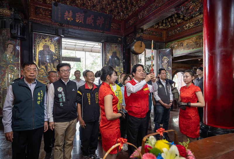 隨後,總統前往「五間厝朝隆宮」參香祈福,祈求臺灣風調雨順、國泰民安,也與臺南鄉親親切寒暄話家常,關心災後復原情形。