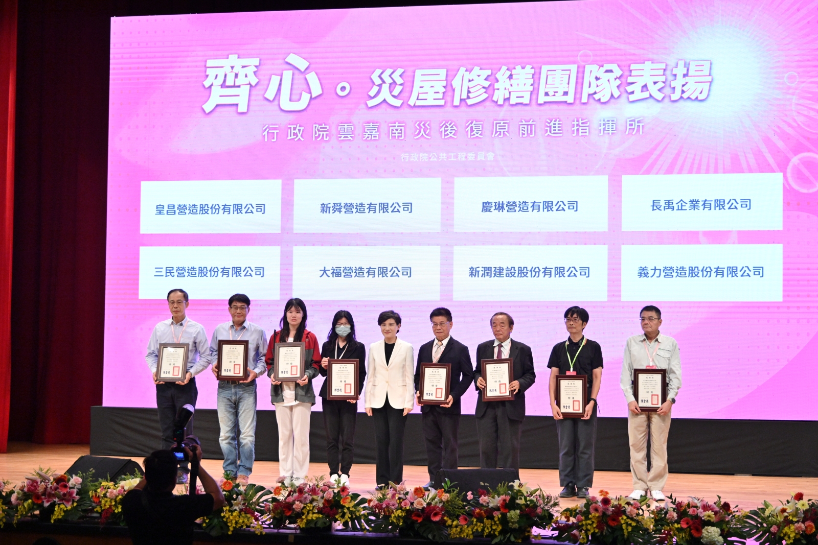 鄭副院長到場後,首先觀賞雲嘉南災後復原重建影片,並於致詞結束後,與指揮官陳金德政委、副指揮官李孟諺顧問與李怡德副主委、執行秘書內政部吳堂安次長、執行秘書經濟部賴建信次長、執行秘書農業部黃昭欽次長、執行秘書環境部沈志修次長、執行秘書原住民族委員會谷縱‧喀勒芳安Qucung Qalavangan副主委、行政院雲嘉南聯合服務中心劉米山執行長、交通部陳彥伯次長、工程會陳為祥副主委、嘉義縣翁章梁縣長、臺南市葉澤山副市長、嘉義市政府工務處余成鈺副處長、雲林縣政府李俊儀簡秘等人一同按下光柱,與技術支援團隊共同完成「齊心點亮,再造幸福」儀式。最後,鄭副院長逐一頒發「特優」感謝狀予72家廠商並合影留念。